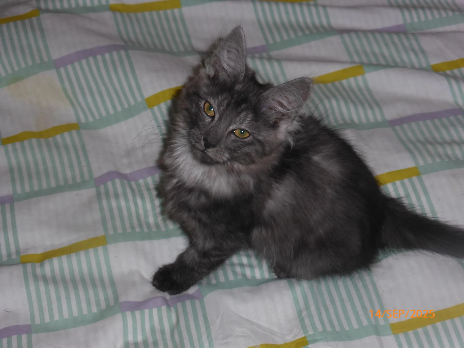 14/09/25 : 3.5 mois, le sevrage total fut compliqué avec une maman qui n'a plus voulu de nous au moment ou on s'est décidé à mettre le nez dans les gamelles, ça a donc pris un peu plus de temps mais tout va bien maintenant ! Moins bavard que mon frère mais tout aussi ronronneur et demandeur de câlins, je suis aussi un peu le plus déluré de la bande!